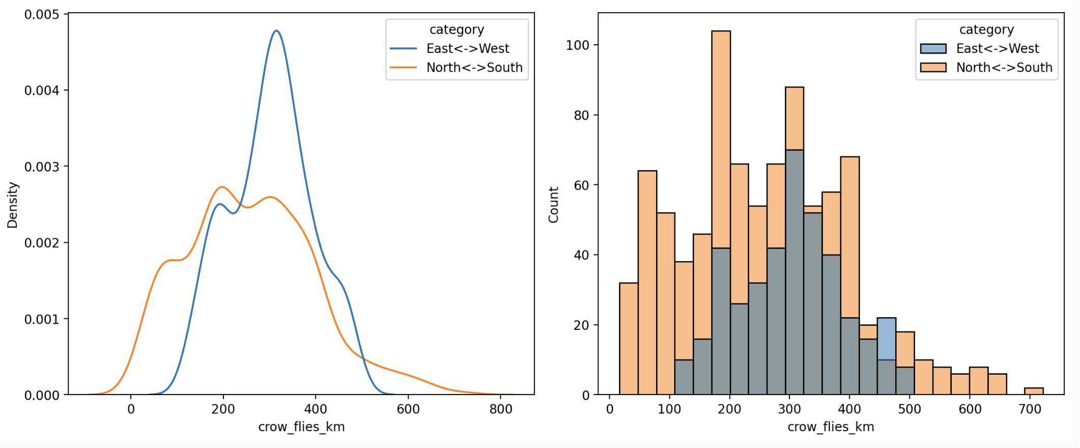 Is it maybe that East↔West journeys are generally longer than North↔South? Perhaps not. If you look at the map of cities you can see there is a cluster of cities near the North↔South boundary.